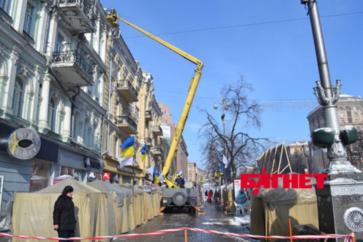 Вчера, 17 февраля, в Киеве сотрудники МЧС пригнали спецтехнику с подъемниками для сбивания льда с крыш зданий ул. Крещатик на стороне палаточного городка сторонников экс-премьера Юлии Тимошенко.