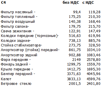 Стоимость некоторых запчастей Citroen С4 (грн)