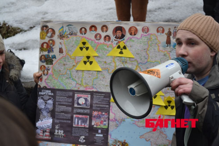 Участники акции собрались на противоположной стороне от здания Кабинета Министров ул. Грушевского, дабы высказать свое недовольство нынешней ситуацией с ядерной безопасностью в Украине. В частности, митингующие обозначили на карте Украины все объекты повышенной техногенной опасности, связанные с производством ядерной энергии, хранением ядерных отходов, и т.д.
