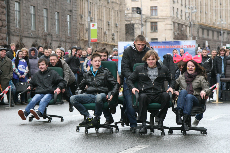 Как сообщает пресс-служба «Молодых регионов», феерическим событием стали гонки на офисных стульях. Конкурс проводился по инициативе «Молодых регионов» лишь второй раз в Украине. В гонках приняли участие около 70 менеджеров компаний, каждый из них в пылу праздника испытывал на прочность своё старенькое кресло, а взамен получал новое офисное. Экстремалы удивляли зрителей своим искусством украшения «боевых машин». Они декорировали кресла флагами, наклейками с логотипами компаний, шариками, перьями, стразами и другими креативными штучками. Состоялось несколько заездов по 5 участников, а самые быстрые приняли участие в финале. Победители получили достойные и актуальные награды – новые директорские кресла.