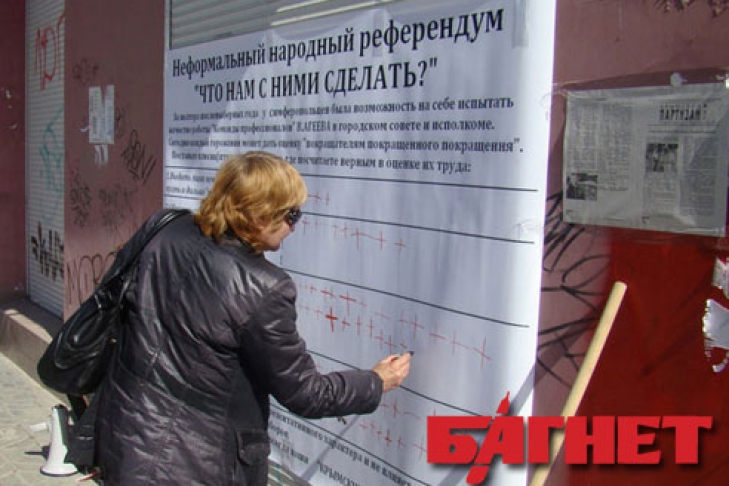 «За полтора послевыборных года у симферопольцев была возможность на себе испытать качество работы «Команды профессионалов» В.Агеева в городском совете и исполкоме. Сегодня каждый горожанин может дать оценку «покращателям покращенного покращення». Поставьте плюсик (птичку, крестик) там, где посчитаете верным в оценке их труда», - говорилось в бюллетене. Ниже горожанам предлагались следующие варианты ответа на вопрос «Что нам с ними сделать?»: