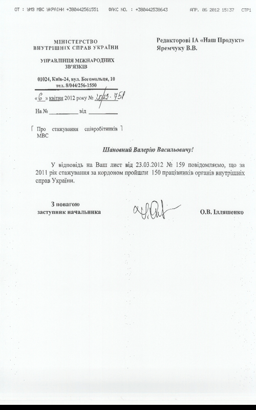 Как стало известно, украинские правоохранители не чуждаются перенимать опыт работы своих коллег из зарубежных стран. Так, в своем ответе в ИГ «Наш Продукт» Алексей Илляшенко, заместитель начальника Управления международных связей МВД Украины заявил, что в течение 2011 года стажировку за границей прошли 150 сотрудников органов внутренних дел Украины.