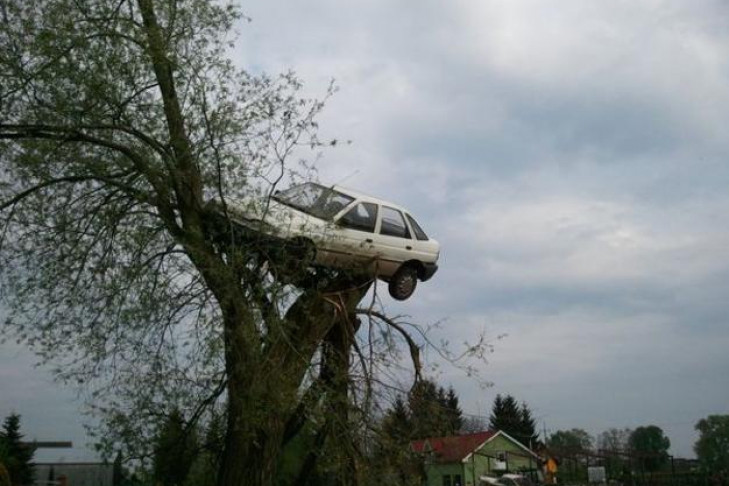 Курьезный случай произошел в небольшом польском селе Любчина, недалеко от Щецина (Западно-Поморское воеводство). Местный автолихач настолько достал своих соседей постоянными выкрутасами на дороге, что те задумали проучить хулигана и… затащили его относительно новый Ford Escort на дерево.