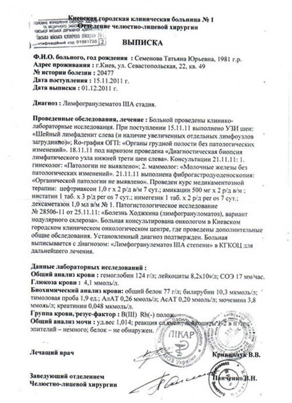 Лечение проходит в г. Киеве, ул.Верховинная, 69, Киевская городская онкологическая больница «Онкоцентр»
