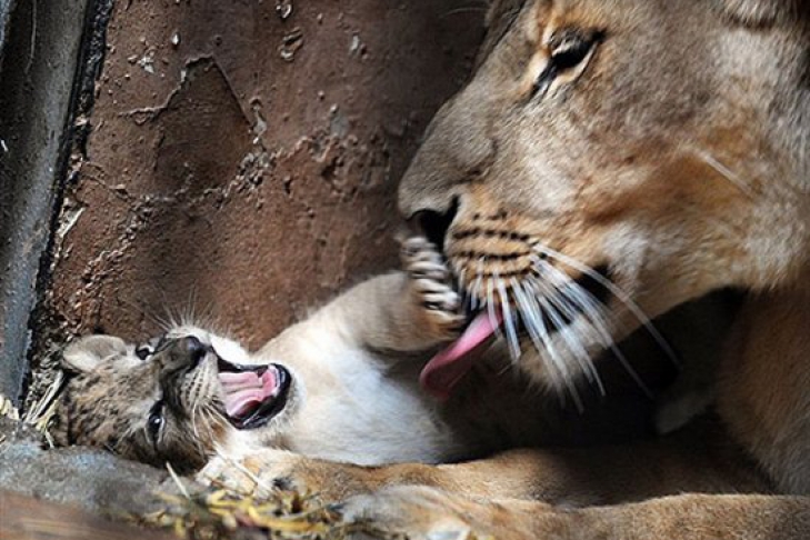 Мама малыша - знаменитая львица Катя, с которой прошлым летом кузнец, художник и владелец частного зоопарка Александр Пылышенко прожил в одной клетке 35 дней, установив тем самым мировой рекорд. Тогда он впервые в мире принял роды у львицы.