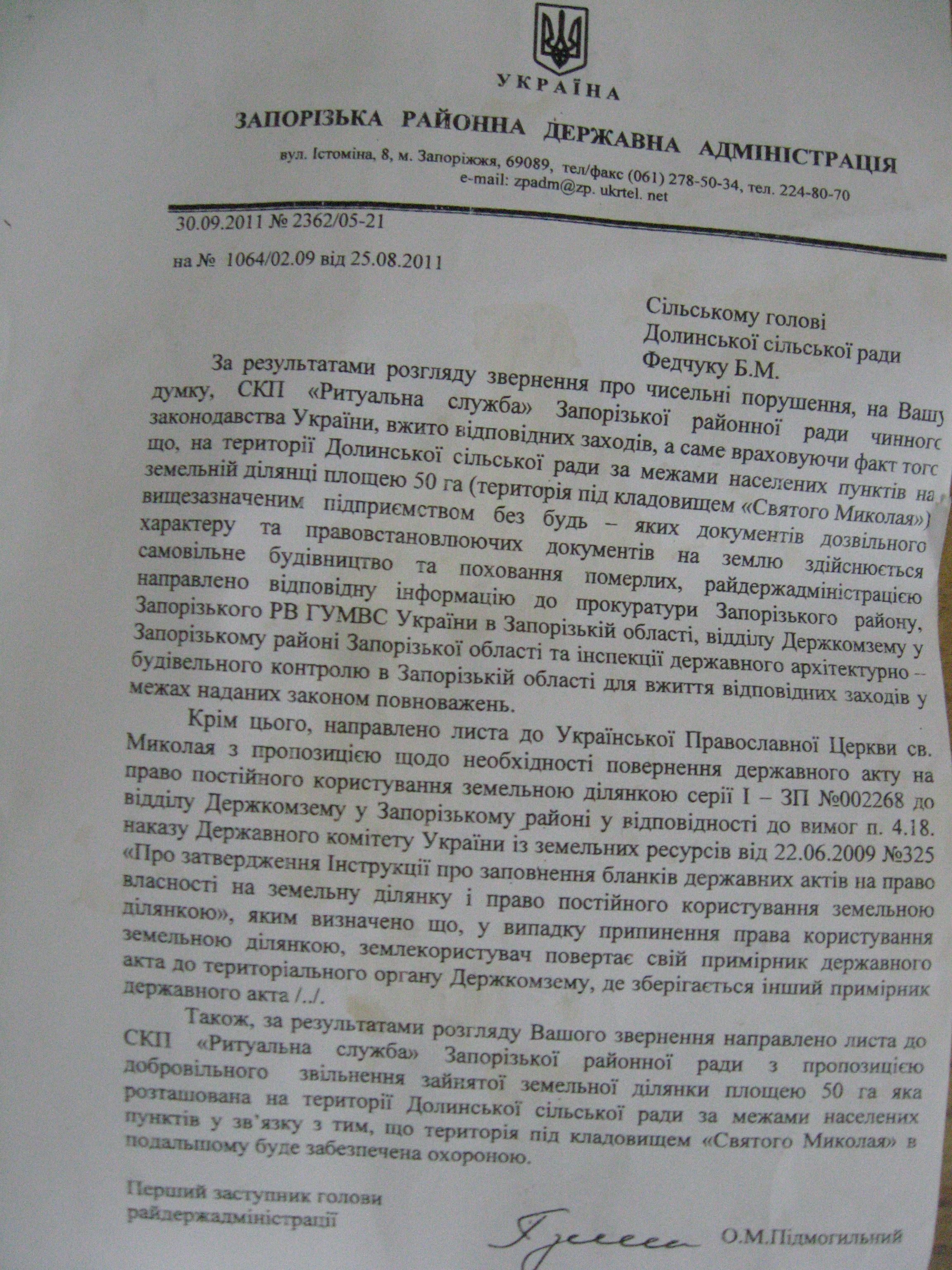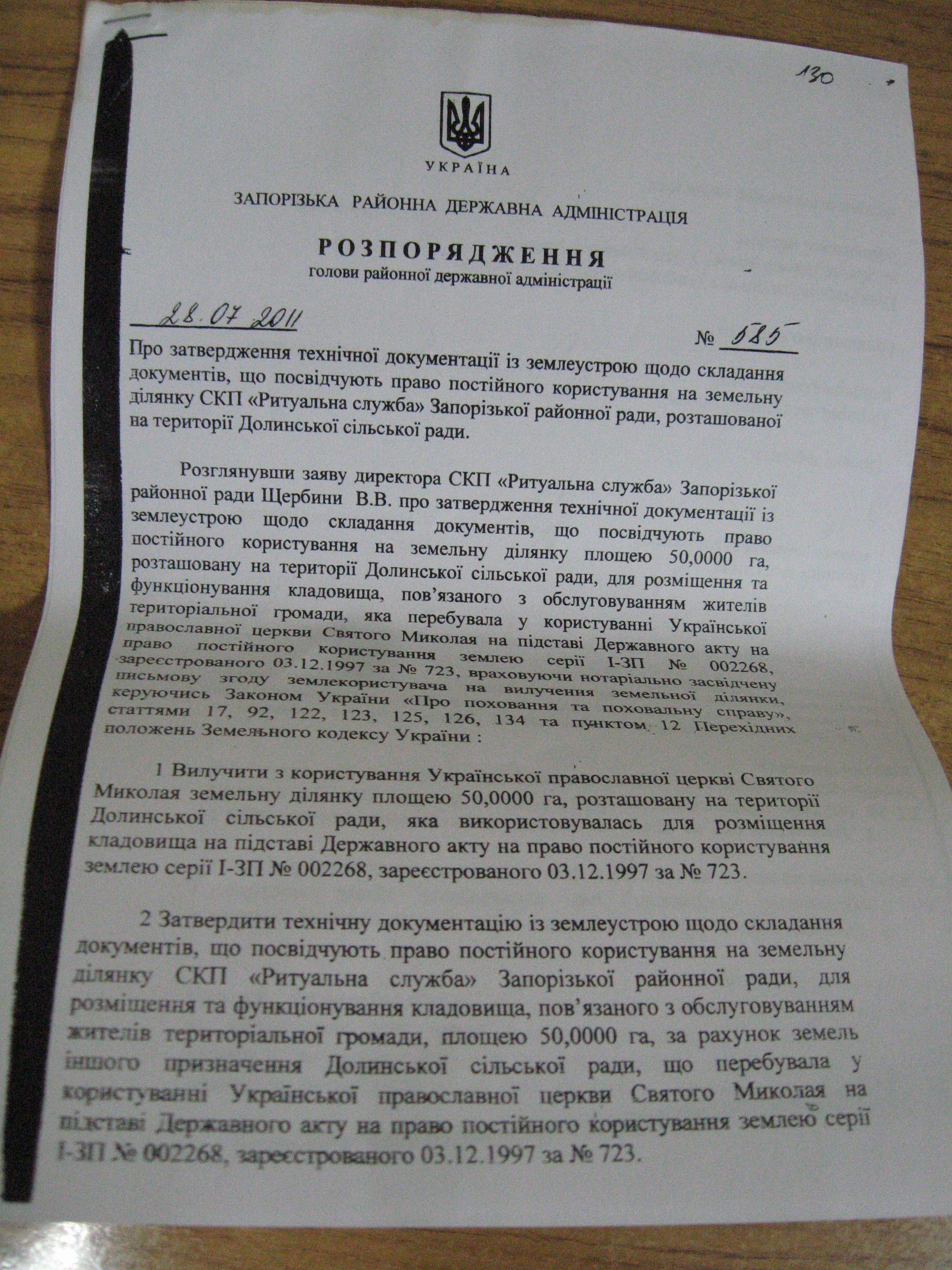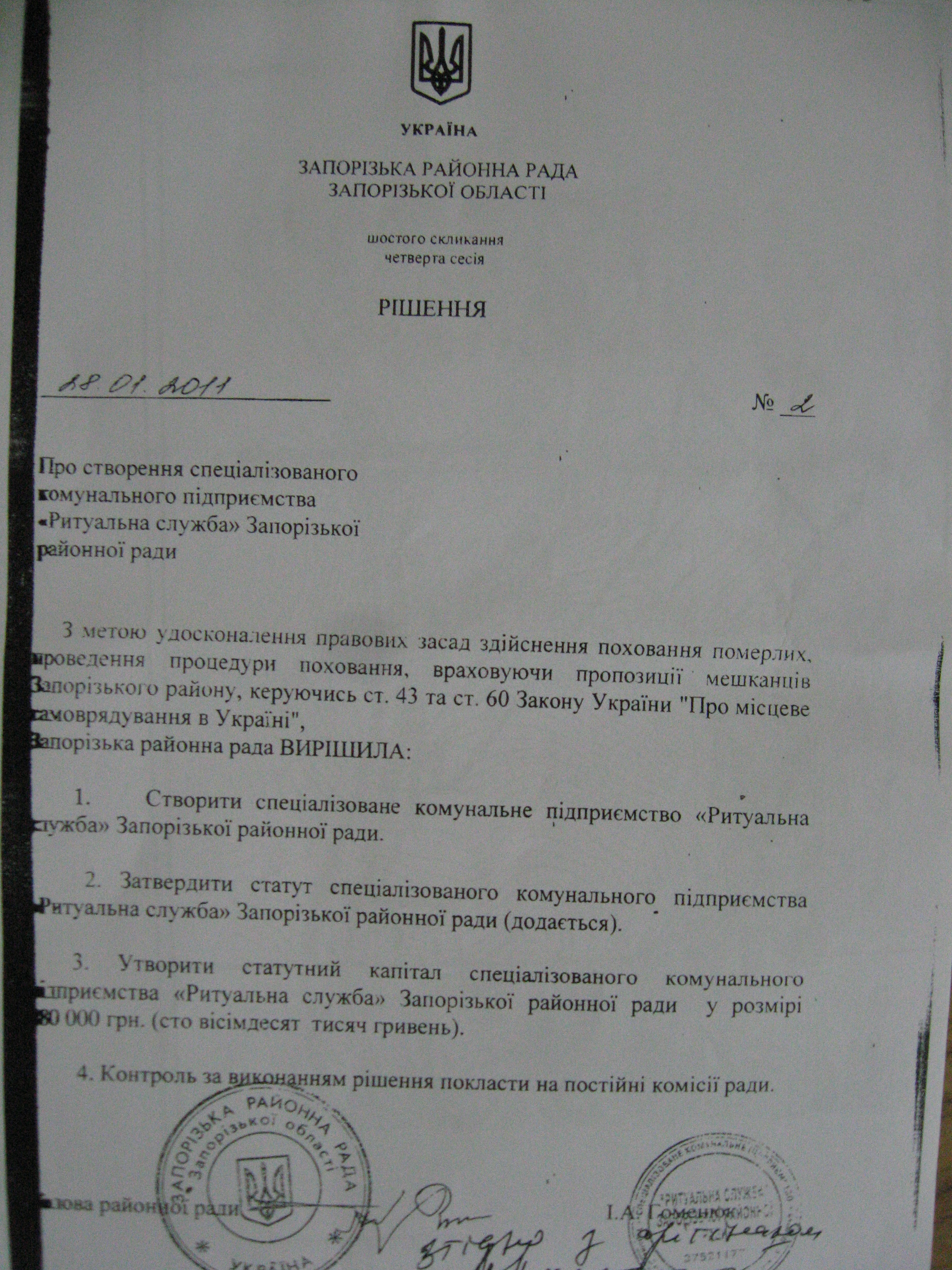 Хотя при этом он отмечает, что Запорожская районная государственная администрация, которая ранее дала разрешение на создание СКП «Ритаульная служба» Запорожского районного совета, позднее признала незаконность ее создания и постановила отменить ранее принятое решение (см. фото документа ниже).