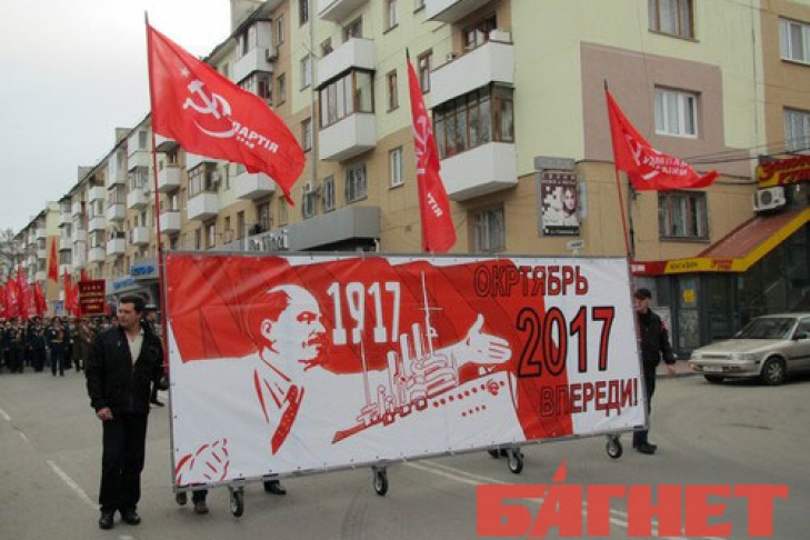 Колонна участников с транспарантами и флагами прошла по центру крымской столицы. Собравшиеся скандировали лозунги: «Да здравствует великая социалистическая революция!», «Слава товарищу Ленину!» и кричали «Ура!».