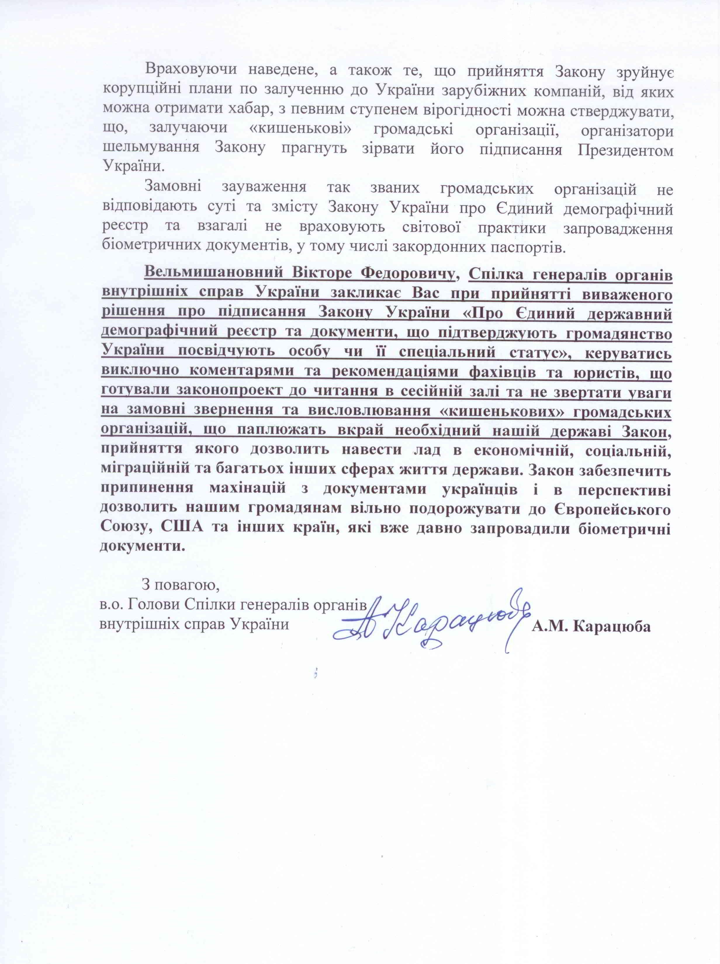 Также члены Союза генералов органов внутренних дел напомнили Виктору Януковичу об обязательствах перед ЕС и необходимости внедрения биометрических паспортов (см. фото документа ниже).