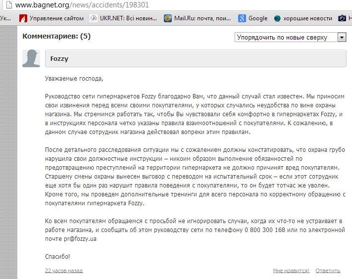 Также администрация обещает провести дополнительные тренинги для всего персонала по корректному обращению с покупателями гипермаркета Fozzy.