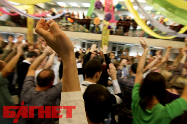 Киевские кришнаиты тоже подготовились к празднеству основательно: команда преданных пять дней готовила угощения. В ходе церемонии, собравшиеся, - уверовавшие и простые гости, - почтенно обошли семь раз символизирующий гору огромный пирог. После этого каждый участник действа получил свою частицу горы и поглотил ее на общем пиру в алтарном зале храма.