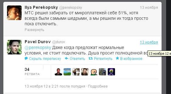 Показательно, что, по сведениям СМИ, такую же «операцию» МТС ранее провела по отношению к сети «Одноклассники». Тогда администрация сайта лишь получила уведомление о повышении, и готовится обсудить предстоящее решение, а вот основатель сети «Вконтакте» Павел Дуров просто-напросто заблокировал возможность оплаты услуг при помощи МТС.