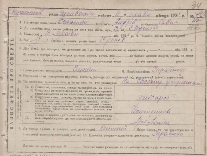 Наглядным примером может служить акт о смерти 19-летнего крестьянина Андрея Остапенко, умершего на Сумщине 13 мая 1933 года.