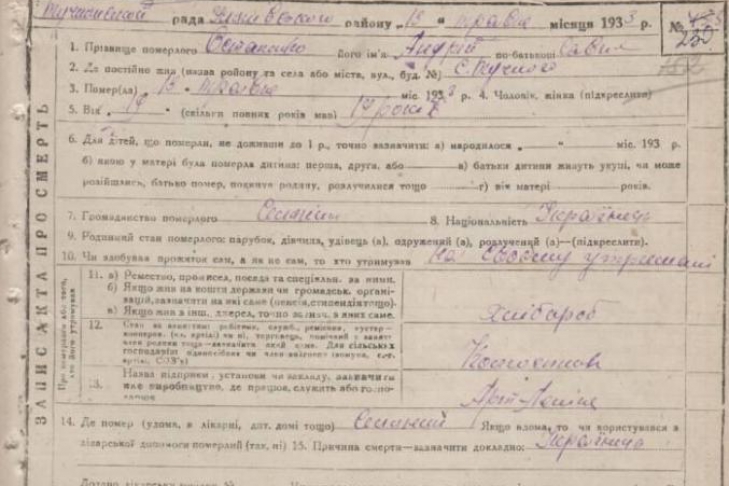 «В голодоморном 1933 году умер колхозник артели Ленина Ульяновского района. В графе «причина смерти», каллиграфическим почерком аккуратно выведено «украинец».