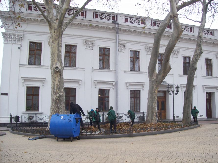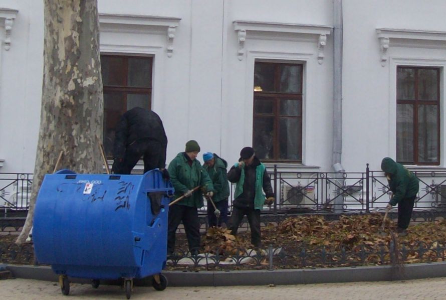 Группа городских рабочих, не брезгующих путешествием в мусорный контейнер, была замечена около мэрии. Коммунальщики убирали опавшие листья и высыпали их в альтфатер. Время от времени в контейнер становился один из рабочих и притаптывал листву.