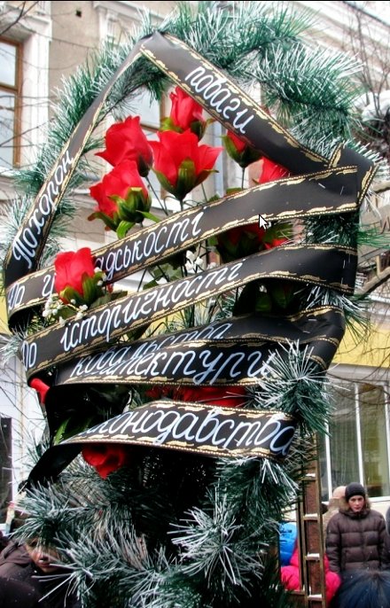 Как сообщается, к участникам праздника подошли несколько представителей житомирского Союза кузнецов и подарили руководителям города символический похоронный венок в знак несогласия с тем, что право изготовить аллею предоставили не им, а другим компаниям.