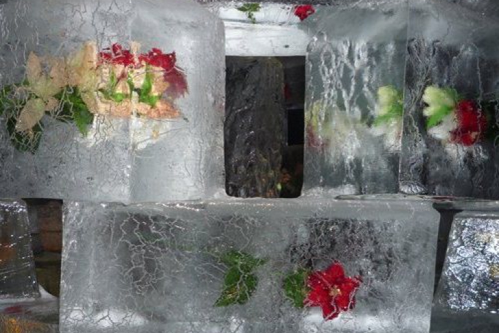 Для наращивания прозрачного льда дизайнеры использовали специальную технологию: макеты цветов устанавливаются в криоблоки, после чего в течение семи дней поэтапно и медленно заливают дистиллированной водой. Последний штрих экспоната - за скульптором, который придает форму ледовой картине.