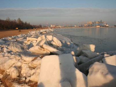 В первые дни нового года в Мариуполе было не по зимнему солнечно и тепло: столбик термометра после обеда разогрелся до +5 градусов. Возле берега в морской воде лед практически растаял, однако толщина льда, вынесенного волнами на берег достигает 20 сантиметров, и тает он очень медленно.