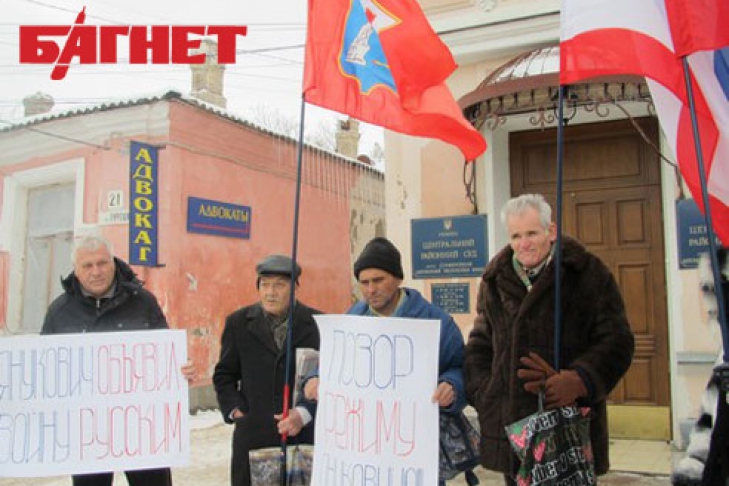 В Симферополе под зданием Центрального райсуда прошел пикет активистов Народного фронта «Севастополь-Крым-Россия» с громким названием «Позор режиму Януковича». Участники акции, которая оказалась не многочисленной, держали в руках севастопольские, крымские и российские флаги, а также плакаты «Янукович объявил войну русским», «Позор режиму Януковича», «НЕТ политическим репрессиям против русских активистов».
