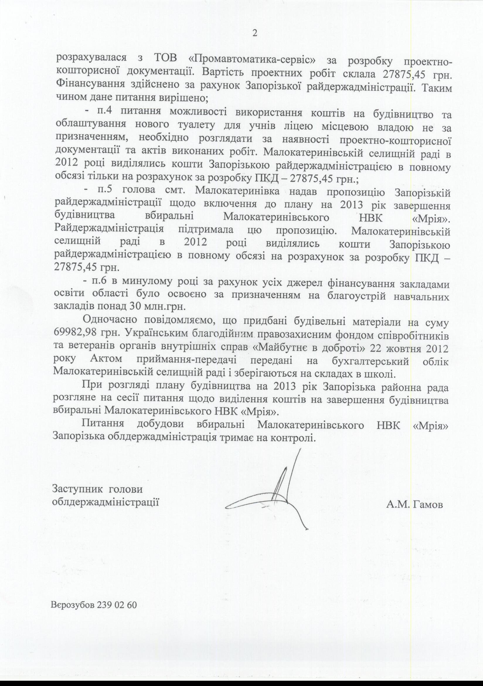 Как уведомила «Багнет» Запорожская областная госадминистрация, отвечая на наш запрос относительно вопиющего бездействия, в частности, Семена Карабаджака (главы Малокатериновской сельрады), - якобы «строительство» уборной для учеников малокатериновского лицея изначально «было начато с нарушением Порядка ведения строительных работ, без наличия всех необходимых нормативных разрешительных документов и проектно-сметовой документации»... В связи с этим, сообщает нам документ, в 2012 году «строительство уборной было приостановлено» (см. фото документа ниже).