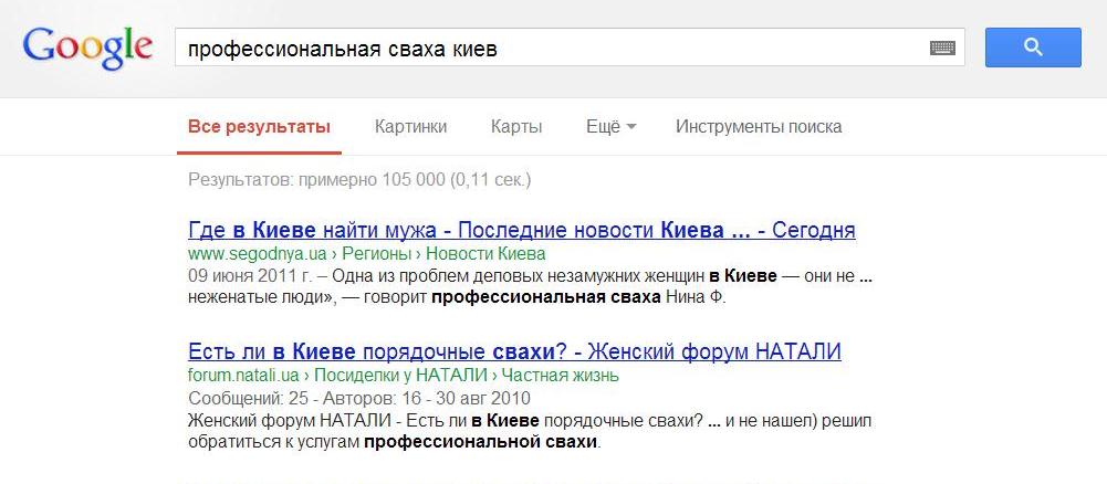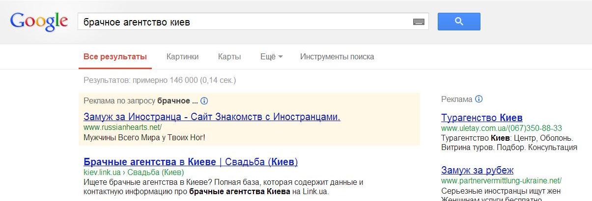 Нас удивило обилие предложений об указании услуг по знакомству с потенциальными мужьями. В поисковике Google нашлось 146 тысяч сайтов по запросу «брачное агентство Киев» и 105 тысяч сайтов по запросу «профессиональная сваха Киев». Такое количество сайтов наталкивает на мысль о том, что знакомства с людьми – прибыльный сегмент бизнеса.