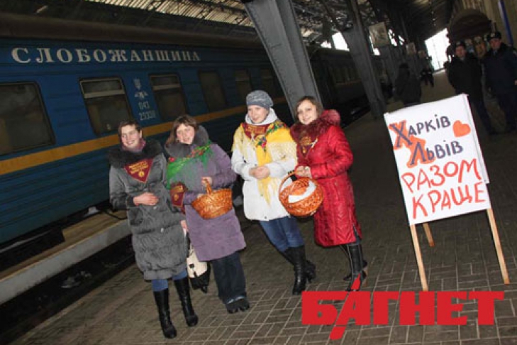 Кроме пампухов, они раздавали сине-желтые ленточки и листовки с информацией о Дне Соборности и Свободы. Также встречающие скандировали «Злука», «Слава Україні, Героям слава!» и «Львів та Харків разом!», а на перроне стоял плакат с надписью «Львів та Харків разом краще».