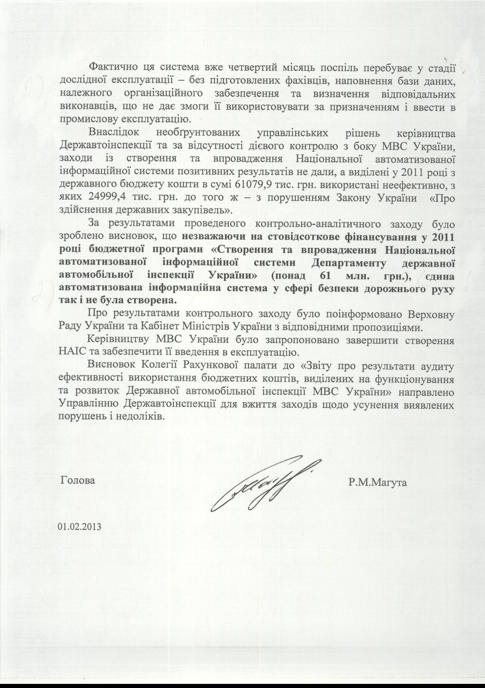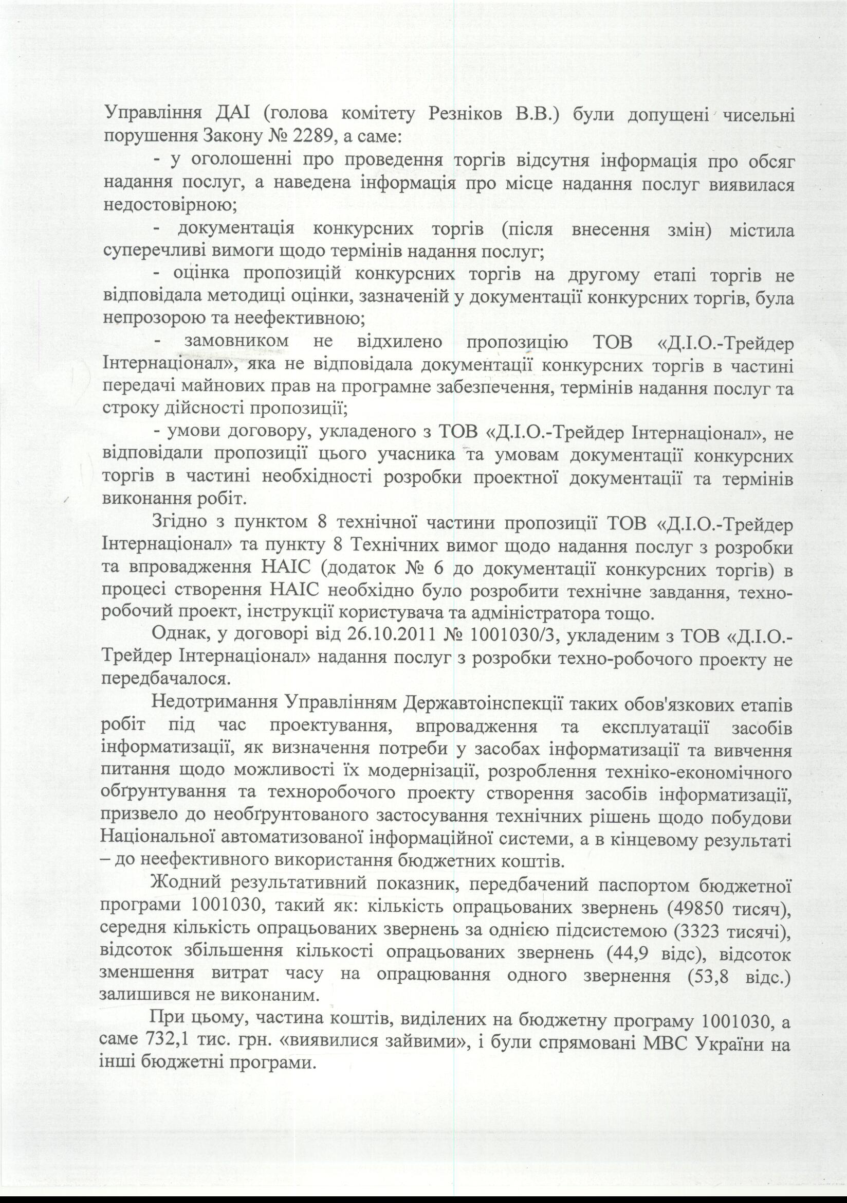Примечательно, что после многочисленных публикаций в СМИ (напомним, «Багнет» еще в 2011 году первым рассказал о «Д.И.О.», схемах их деятельности и предполагаемых высоких покровителях этой скандальной коммерческой структуры, причастной к созданию НАИС) и массового недовольства автолюбителей, наконец-то «прозрели» и контролирующие органы. Аудиторы Cчетной палаты Украины подтвердили, что многочисленные нарушения во время проведения тендера и определение компании, которая в состоянии разработать и внедрить НАИС, действительно имели место. Об этом говорится в ответе на информационный запрос редакции ИА «Наш Продукт», отправленный еще в январе 2013 года (см. ниже фото документа).