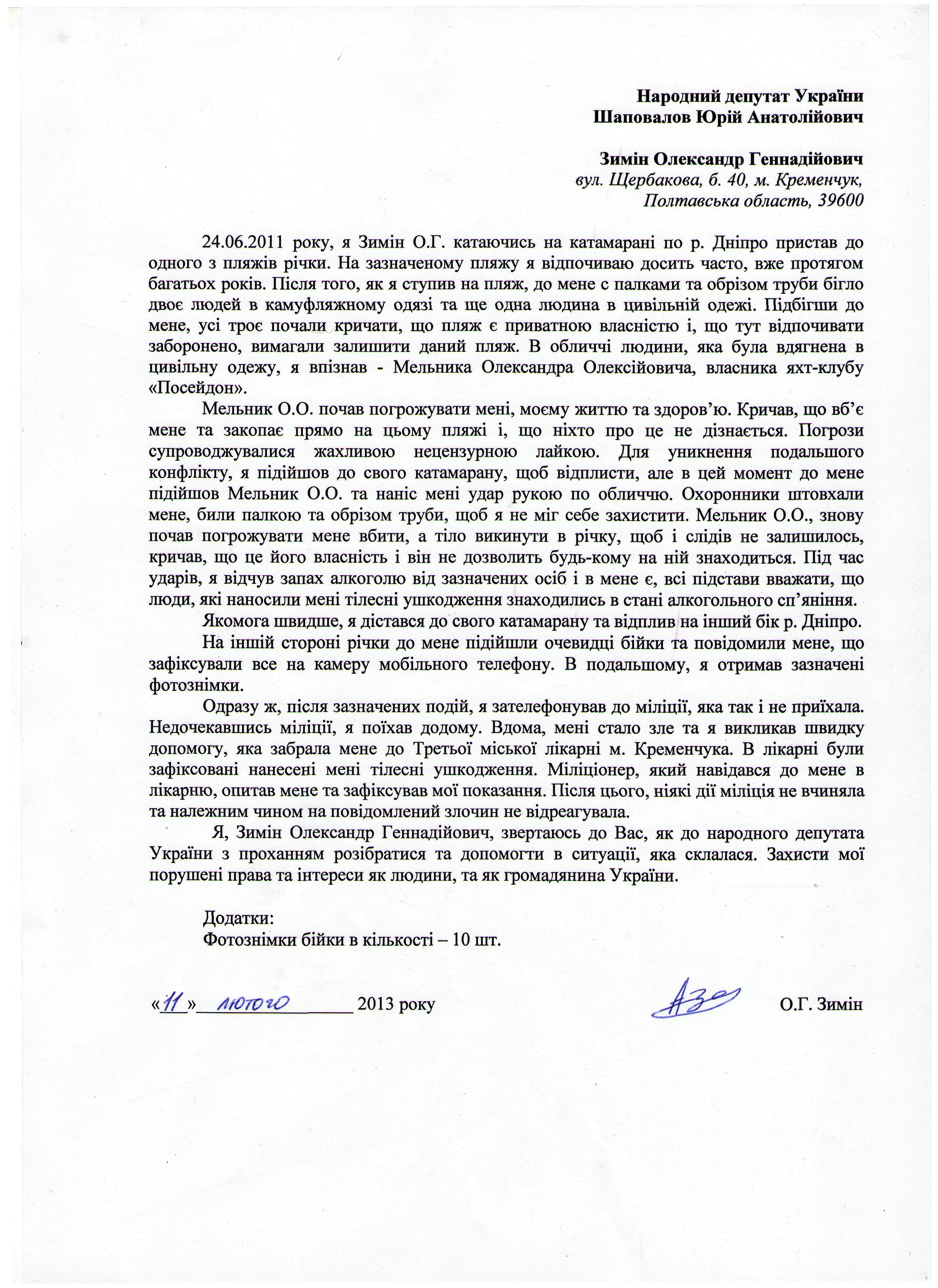 Одной из жертв медиамагната Александра Мельника стал простой кременчужанин Александр Зимин. Он имел неосторожность причалить на катамаране к «запретному» берегу. К нему почти сразу же прибежали трое – двое в форме частной охраны с обрезком трубы и палкой, а один в обычной одежде. С дикими нецензурными возгласами, размахивая руками и палками, они бросились в атаку на парня.
