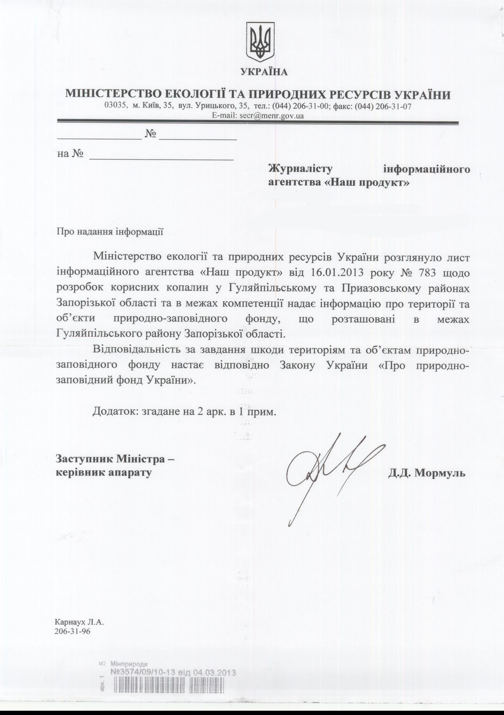 Очевидно, что в Минэкологии и природных ресурсов, без ведома которого получить разрешение на разработку полезных ископаемых вряд ли удалось бы, могли бы пролить свет на данный вопрос. Редакция поинтересовалась, действительно ли в окрестностях города Гуляйполе разрешено разрабатывать полезные ископаемые, какие именно, какое ведомство, по действующей процедуре, дает разрешение на подобные разработки, были ли получены соответствующие разрешения на разработку. Должны ли проводиться изучения рисков и потенциальных угроз окружающей среде и людям, проживающим вблизи подобных объектов. И, казалось бы, совершенно безобидные вопросы: есть ли на территории Гуляйпольского района природоохранные территории, заповедные зоны и является ли Гуляйпольский район экологически благополучным, какие угрозы для населения и окружающей среды может иметь сведения открытой урановой шахты.