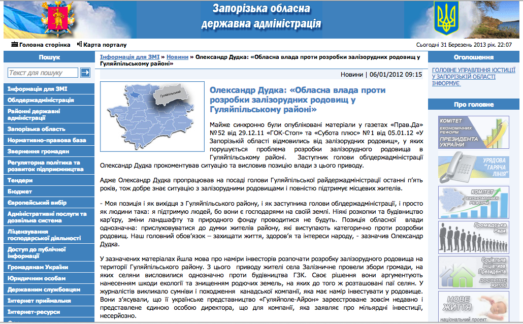 В начале 2012 года, задолго до парламентских выборов, Дудка крайне резко высказывался против разработки рудника, распинаясь перед гуляйпольцами о том, что не допустит трагедии и заставит местных чиновников прислушаться к народному мнению. Сладкая ложь лилась рекой, о чем говорит, в частности, одна из публикаций на официальном сайте Запорожской облгосадминистрации, которая по сей день, как ни странно, не была удалена в свете происходящих событий (см. фото ниже).