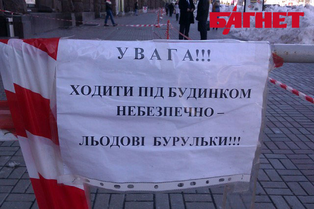 Сейчас гулять по главной улице украинской столицы - Крещатику - местами опасно. Об этом предупреждают таблички под зданиями, которые здесь находятся. Корреспондент «Багнета» зафиксировал множество мест, где на голову невнимательного прохожего может упасть сосулька или кусок мокрого снега. Кое-где несколько метров у зданий ограждены турникетами (фото таких мест смотрите в фотогалерее). Но есть и места, где таких ограждений нет. Поэтому редакция Багнета призывает горожан быть внимательными и почаще смотреть вверх, гуляя по Крещатику.