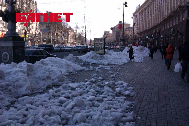В то время как столбик термометра наконец-то начал показывать плюсовую температуру, главная улица страны - Крещатик - местами напоминает морское побережье. Дворники почему-то не спешат разбросанный лед на тротуаре. Хотя, возможно, причина тому - чисто эстетическая. Если посмотреть на Крещатик под определенным углом и подключить фантазию, может показаться, что он похож на усыпанное льдом морское побережье.