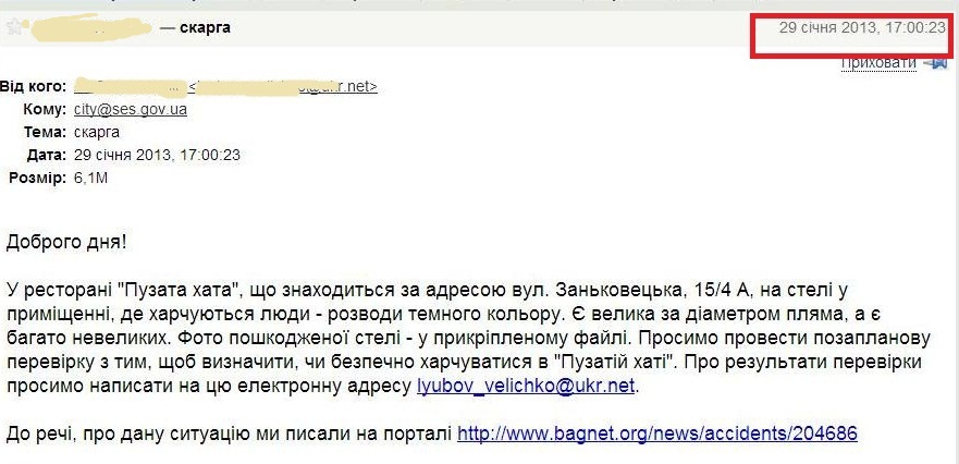 Через две недели «Багнет» повторно убедился, что ремонт в помещении не сделан, а подозрительные пятна растут. Тогда журналисты решили разобраться, опасны ли эти разводы для посетителей «Пузатой хаты» и написали письменную жалобу на e-mail СЭС city@ses.gov.ua.