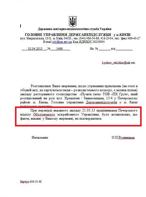 В СЭС нам пообещали рассмотреть заявление и в ближайшее время на него ответить. Правда, «в ближайшее время», по версии чиновников, значит через два месяца. В своем письменном ответе начальник Главного управления госсанэпидемслужбы в г. Киеве О. Рудницкая, утверждает, что проверка была проведена аж 21 марта. При этом, никаких пятен на потолке инспекторы не заметили…