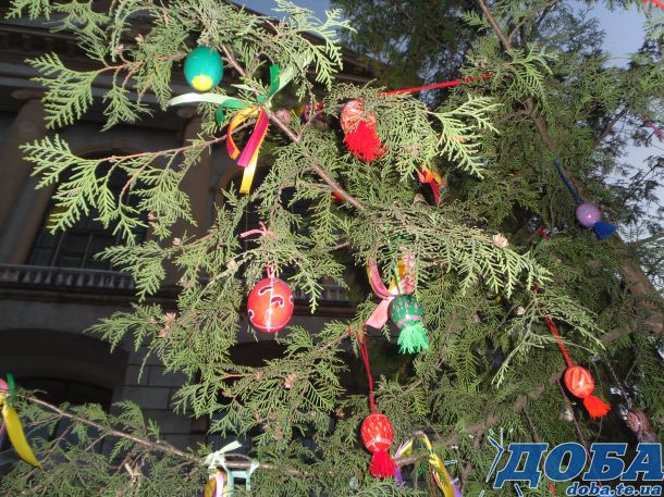Разноцветные яйца прикрепили красочными лентами, чтобы их было видно за несколько метров. Тернополяне такой инициативе детей только рады и уже фотографируются возле «пасхальных деревьев».