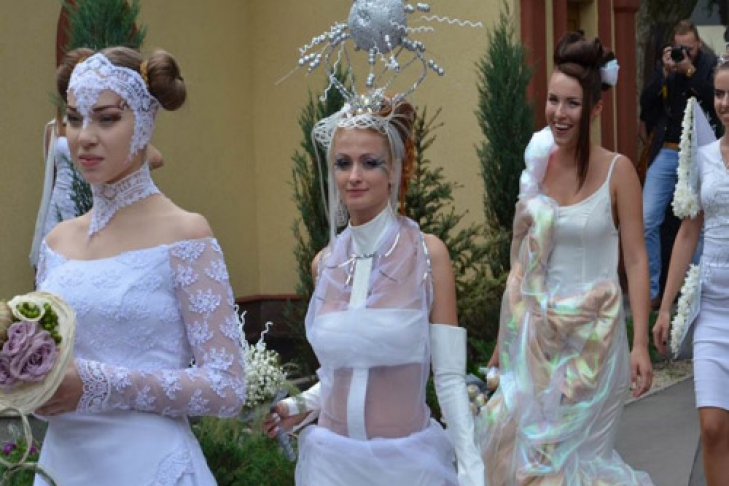 В Харькове состоялся парад невест. Девушки прошлись по улицам города и продемонстрировали свои наряды в пяти образах: «леди-мама», «бизнес-леди», «леди-профи», «леди-публичность» и «леди-будущее».