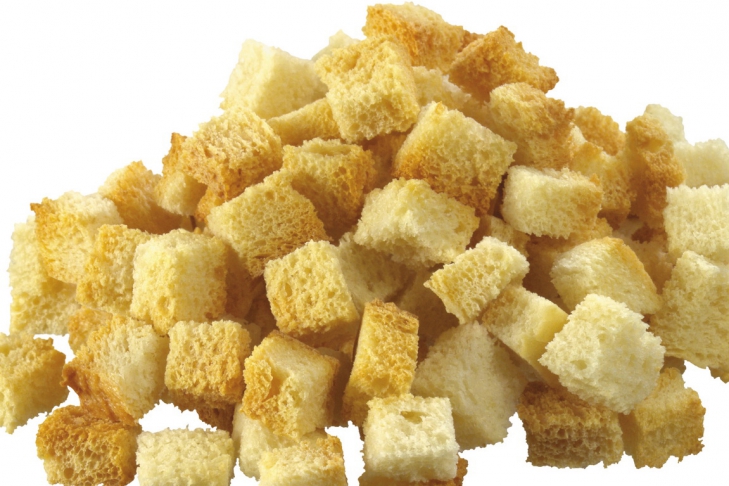 Берем остатки вчерашнего батона, нарезаем на небольшие кубики, посыпаем их солью (можно добавить любимые травки по вкусу, например, средиземноморские или даже обычный сушеный базилик), взбрызгиваем оливковым маслом и выкладываем в один слой на дно кастрюльки мультиварки. Включаем режим «Выпечка».