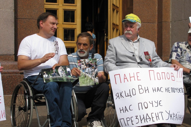 Организатор акции – предприниматель и инвалид первой группы Александр Олександр Пустовойт – президент Федерации санного спорта Украины, член Национального олимпийского комитета, обращается к Попову: «Из-за нарушения вами и вашими подчиненными достигнутых между мною и вами договоренностей я и мои товарищи, инвалиды на колясках, планируем начать акцию протеста возле здания КГГА на Крещатике».