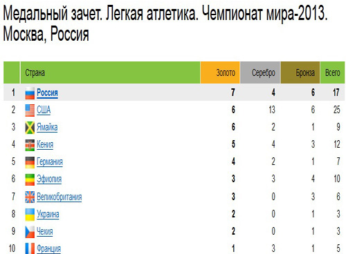 17 августа в столице России завершился чемпионат мира по легкой атлетике. В неофициальном общекомандном медальном зачете легкоатлетический мундиаль выиграли хозяева соревнований.