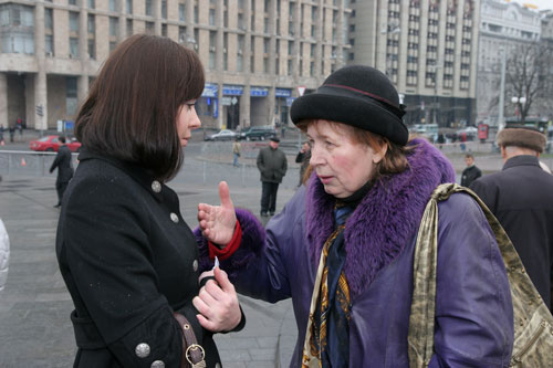 В Киеве на майдане Незалежности проходит митинг, приуроченный к приезду Джорджа Буша. Около пятисот пожилых людей то и дело скандируют: «Не дадим Украину затянуть в болото»