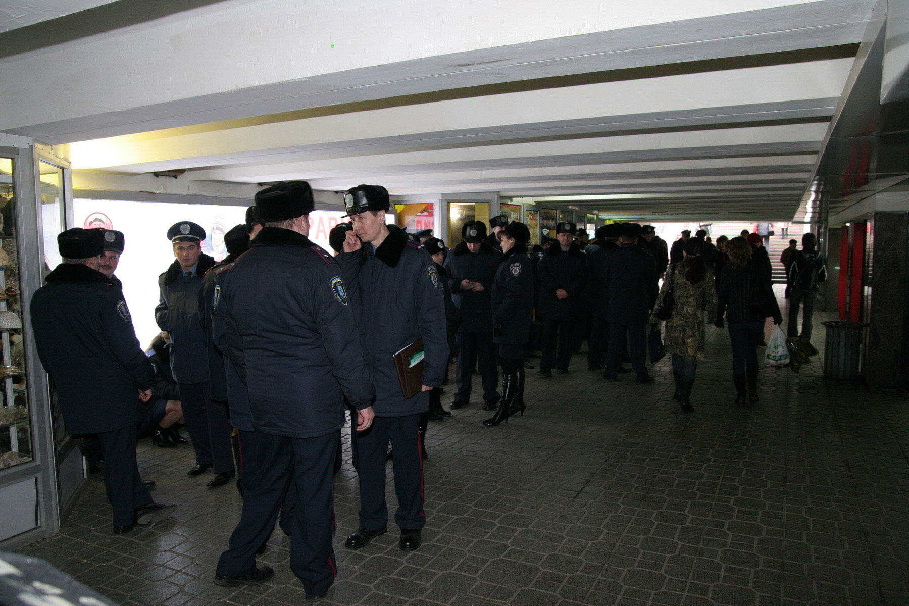 А тем временем, пока митингующие мокнут под моросящим дождем, около 40 милиционеров ютятся в подземном переходе на станции метро «Майдан независимости» (см. фото). Одни кофе возле ларьков пьют, другие курят.