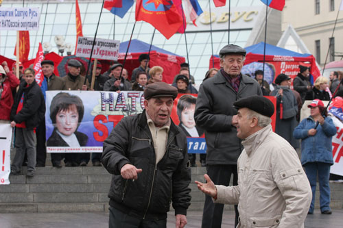 Бабушки с дедушками держат в руках яркие плакаты с надписями «Yankee – go home», «НАТО – война, смерть, слезы», «Распустим НАТО - защитим демократию» и красные флаги – неотъемлемый символ коммунизма.