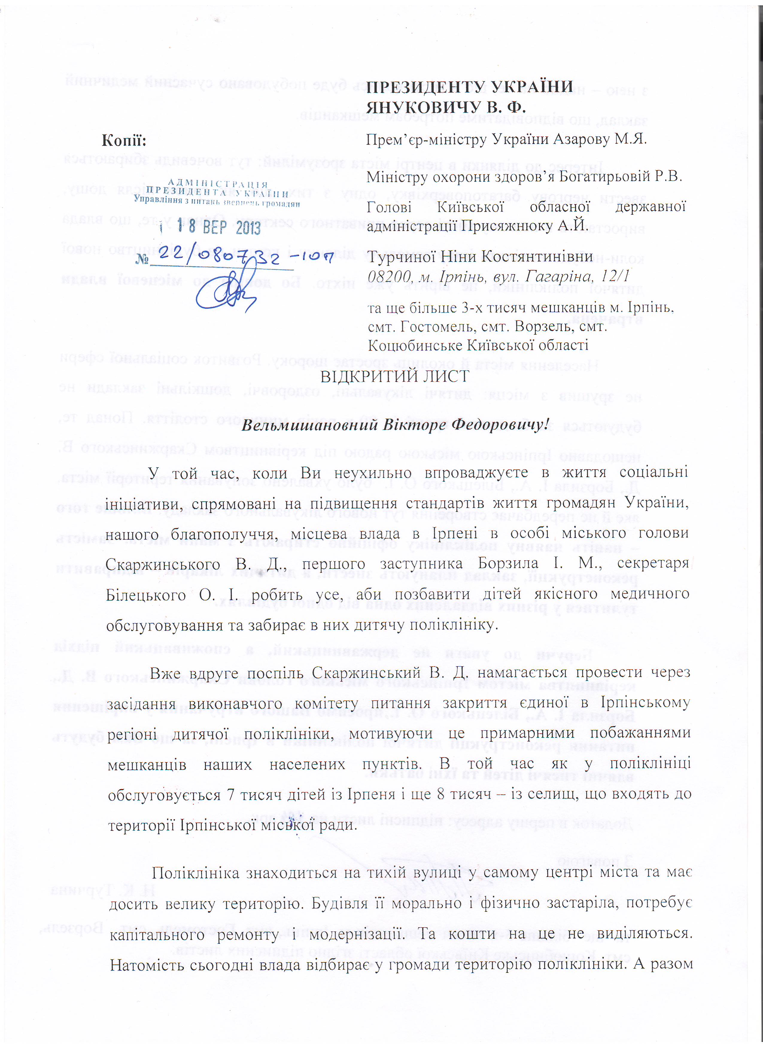 В Ирпене собираются снести единственную детскую поликлинику – люди обратились к Януковичу (ДОКУМЕНТ)
