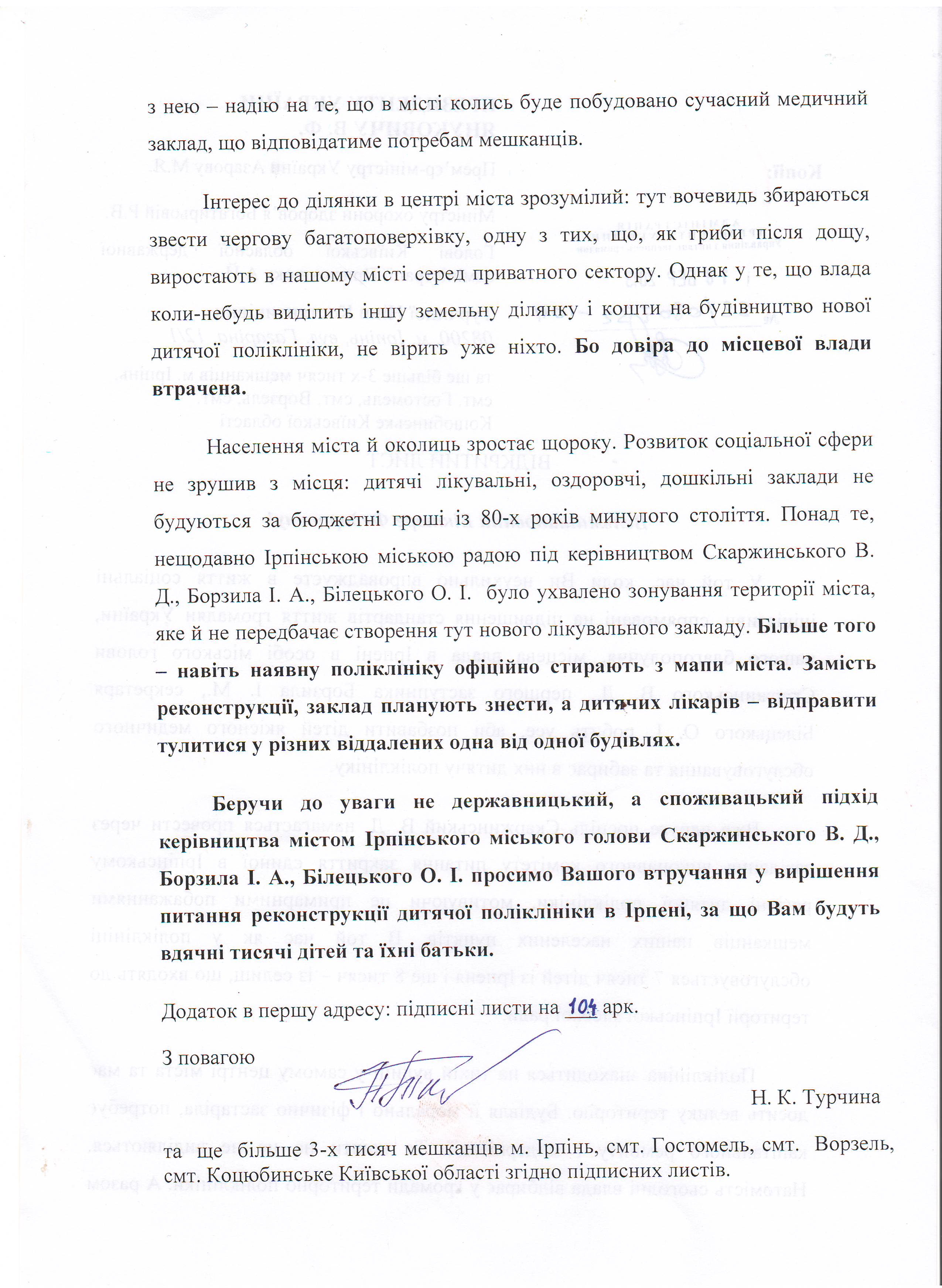 Более 3000 жителей Ирпеня, которые подписались под письмом, просят Президента вмешаться в сложившуюся ситуацию, поскольку территория поликлиники, скорее всего, будет отдана под возведение жилого дома. «Поликлиника находится на тихой улице в самом центре города и имеет достаточно большую территорию. Здание ее морально и физически устарело, требует капитального ремонта и модернизации. Но средства на это не выделяются… Интерес к участку в центре города понятен: здесь явно собираются возвести очередную многоэтажку… Однако в то, что власть когда-нибудь выделит другой земельный участок и средства на строительство новой детской поликлиники, не верит уже никто», - отмечают авторы обращения.