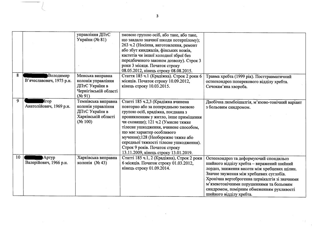 Об этом заявил высокопоставленный руководитель упомянутой службы на условиях анонимности. По его словам, после того, как СМИ начали активно освещать тему возможного лечения Юлии Тимошенко за рубежом, многие заключенные, которые действительно нуждаются в медицинской помощи, стали настаивать на отправке их на лечение в зарубежные клиники. Ниже мы приводим часть списка заключенных, которые написали официальные заявления на проведение подобного лечения. С целью сохранения конфиденциальности личной информации, фамилии отбывающих срок не указываются. В списке представлены мужчины и женщины из разных исправительно-трудовых учреждений Украины. Многие из них имеют страдают от болезней опорно-двигательной системы, как и в случае с Юлией Тимошенко.