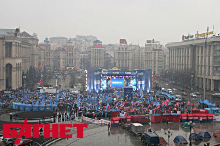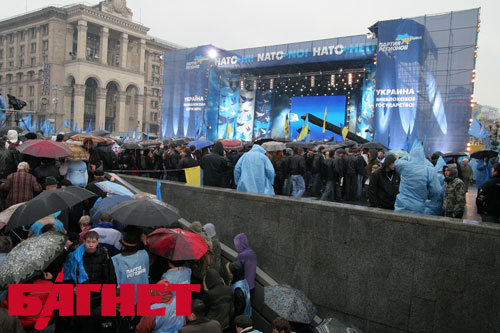 Вчера на Майдане представители оппозиции в лице Партии регионов, митинговали против членства нашей страны в НАТО. Даже проливной дождь не испугал приверженцев регионалов. Обмотанные в голубые дождевики, с такого же цвета флагами, они заполонили центральную площадь Киева.