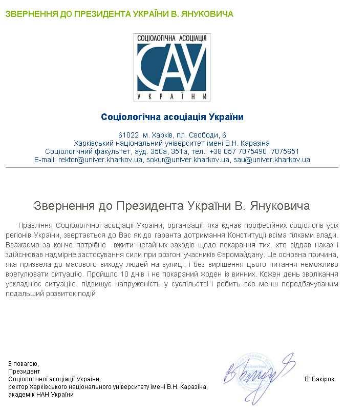 Социологическая ассоциация Украины обратилась к Виктору Януковичу с обращением – урегулировать критическую ситуацию, начав со справедливого наказания виновных в избиении участников мирных акций протеста (см. документ, опубликованный в Facebook, ниже).