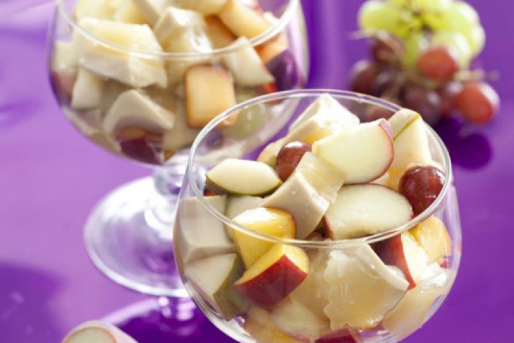 Добавить нарезанные фрукты в миску с заправкой, перемешать, положить холодные квадратики желе, еще раз перемешать. Подавать немедленно.