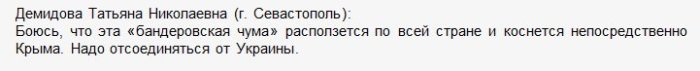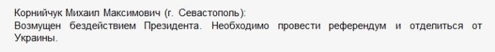 Так, крымчане призывают Президента Украины к решительным действиям в отношении митингующих на «майдане», просят руководство МВД разогнать «Майдан» и навести порядок в Киеве. Среди опубликованных заявлений есть призывы отсоединить Крым от Украины.