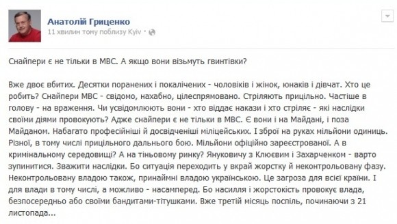 «Снайперы есть не только у МВД. Есть они и на Майдане и вне Майдана. Намного более профессиональные и опытные, чем милицейские. И оружия на руках миллионы единиц, в том числе прицельного дальнего боя», — заявил Гриценко.