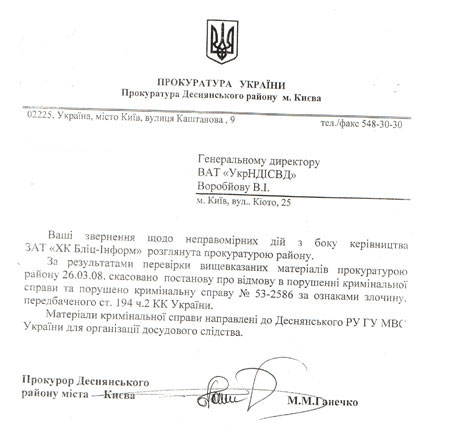 Прокуратура Деснянского р-на г.Киева возбудила уголовное дело по факту нанесения убытков госпредприятию частной компанией «Блиц-Информ»